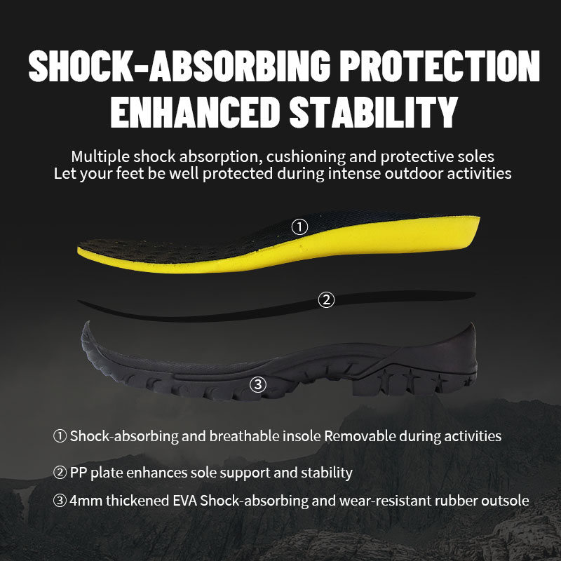 ① Polsterdatud, hingav sisetald – eemaldatav, kui peate selle puhastama või välja vahetama. ②Tugevdatud PP-plaadiga täiendavaks jalaaluseks toeks – nii et iga samm tundub kindel ja kontrollitud. ③4 mm paksendatud EVA põrutusi neelav ja kulumiskindel kummist välistald.