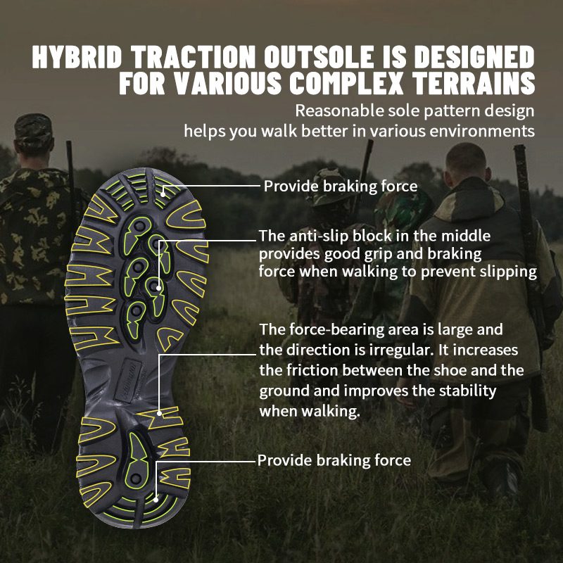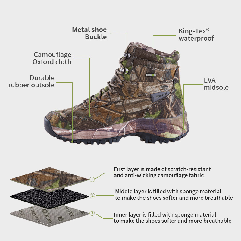 ①Esimene kiht on valmistatud kriimustuskindlast ja niiskuskindlast kamuflaažikangast. ②Keskmine kiht on täidetud käsnmaterjaliga, et muuta jalatsid pehmemaks ja hingavamaks. ③Sisemine kiht on täidetud käsnmaterjaliga, et muuta jalatsid pehmemaks ja hingavamaks.