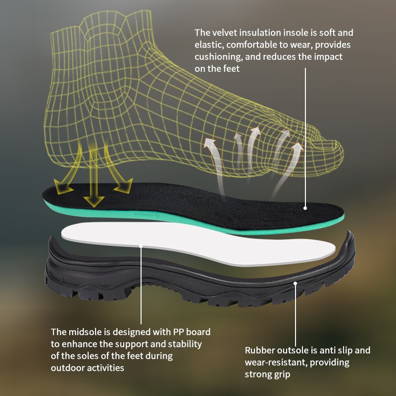 ① Sametine vooder. Pehme jala all. Neelab mõju. ②PP-vahetald stabiilseks toeks. ③ Kummist välistald, mis ei lase lahti. Haarab, kestab, püsib töökindel.