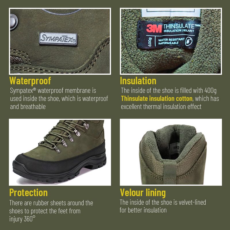 Need Sympatexi veekindlad isolatsiooniga Thinsulate jahisaapad on saadaval värvide, materjalide ja detailide kohandamiseks, MOQ-ga 800 paari, mis sobivad ideaalselt brändikoostööks ja rühmahankeks. Ja neil jahisaabastel on järgmised eelised:
