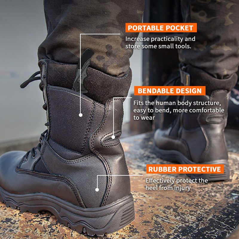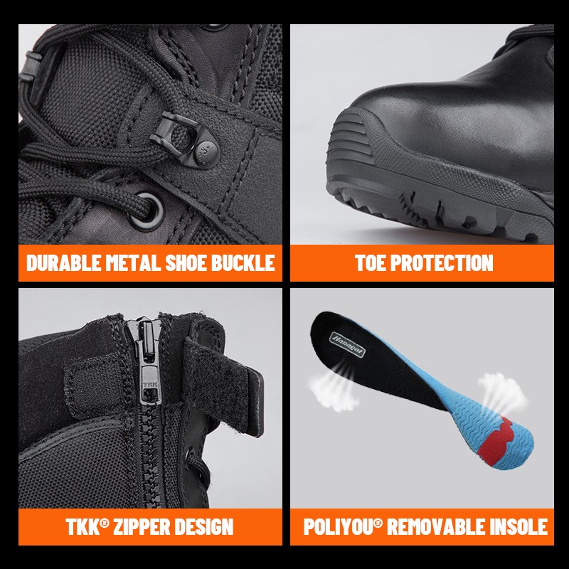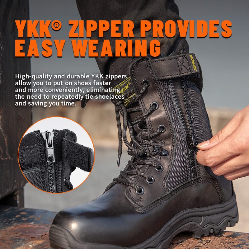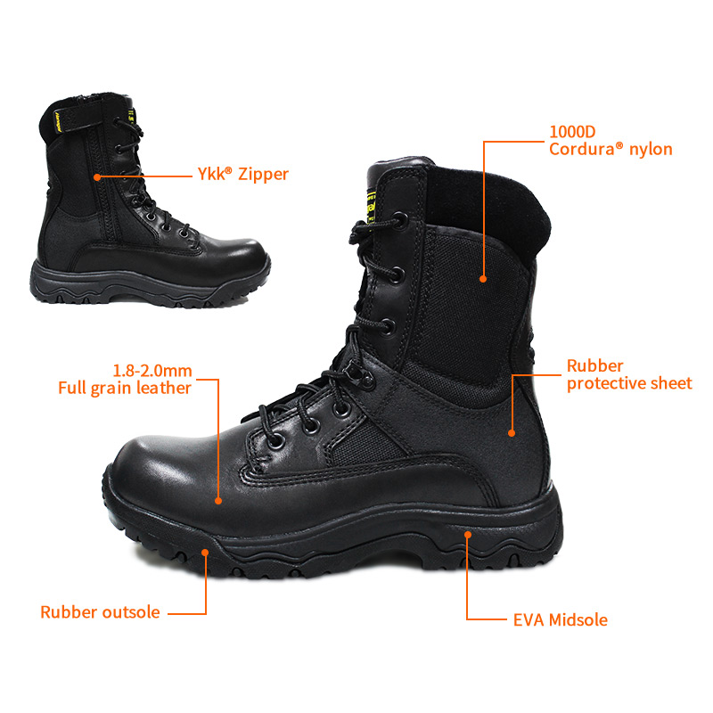 Need YKK tõmblukuga täisnahast politseisaapad on saadaval värvide, materjalide ja detailide kohandamiseks, MOQ-ga 800 paari, mis sobivad ideaalselt brändikoostööks ja rühmahankeks. Ja neil jahisaabastel on järgmised eelised: